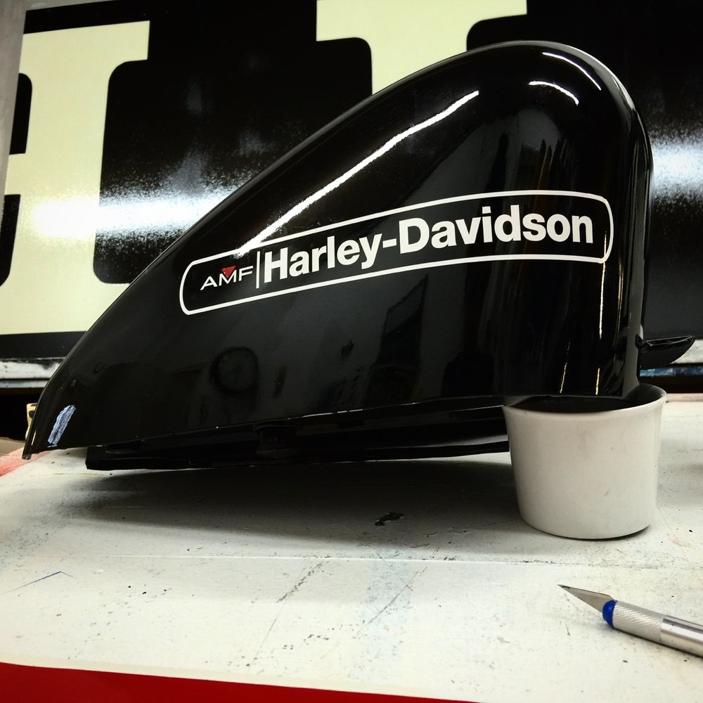 Harley Davidson AMF Side Cover Decal. 61704-76 available at Lancaster Harley-Davidson pennsylvania P-717-464-2703. - Other sizes available upon request.